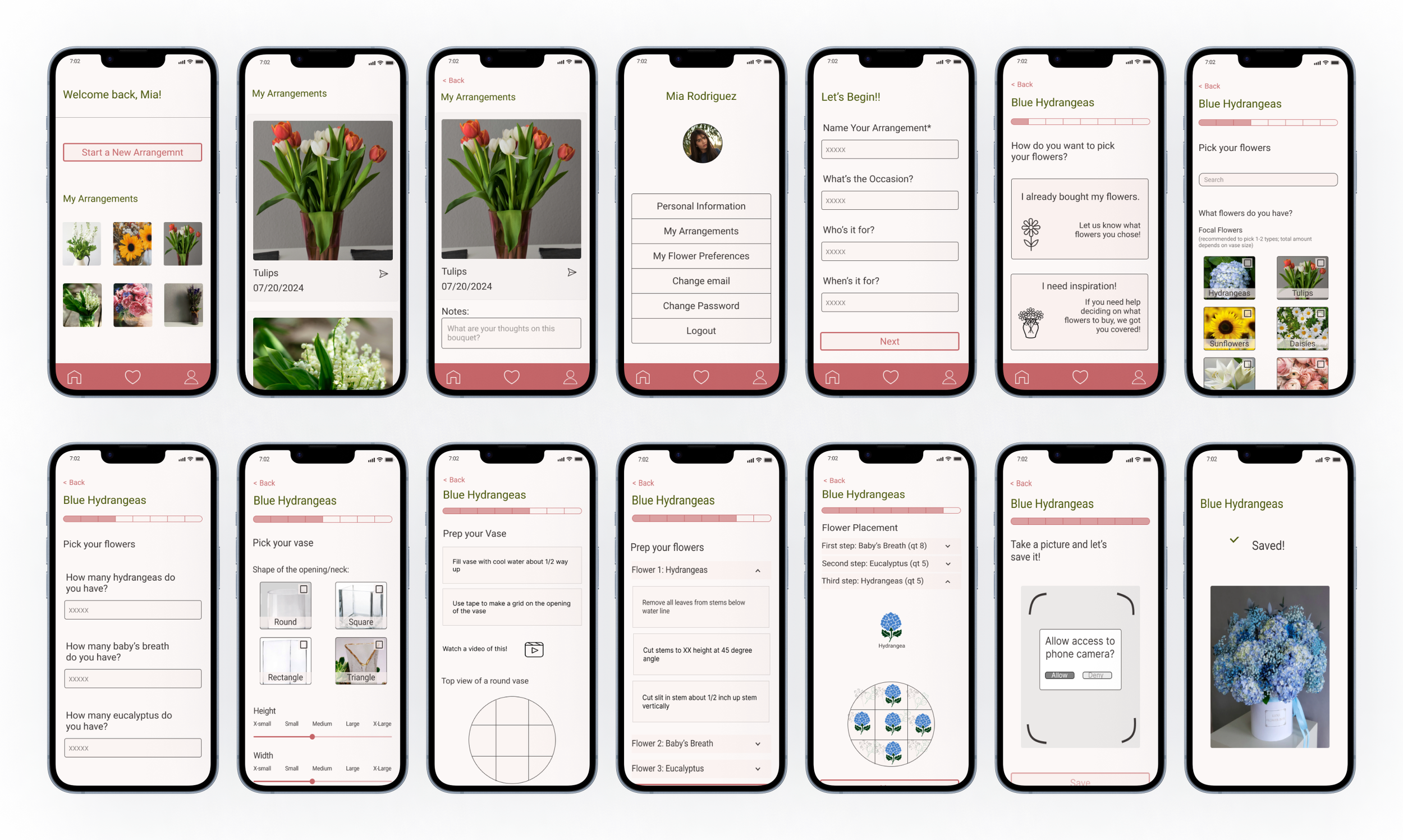 Iterations were made based on priority and time constraints. Features that were iterated on include the ‘Flower Placement’ page format, the order of steps (switching vase prep and flower prep), as well as adding a ‘skip’ option for the final page of saving the arrangement with a picture.